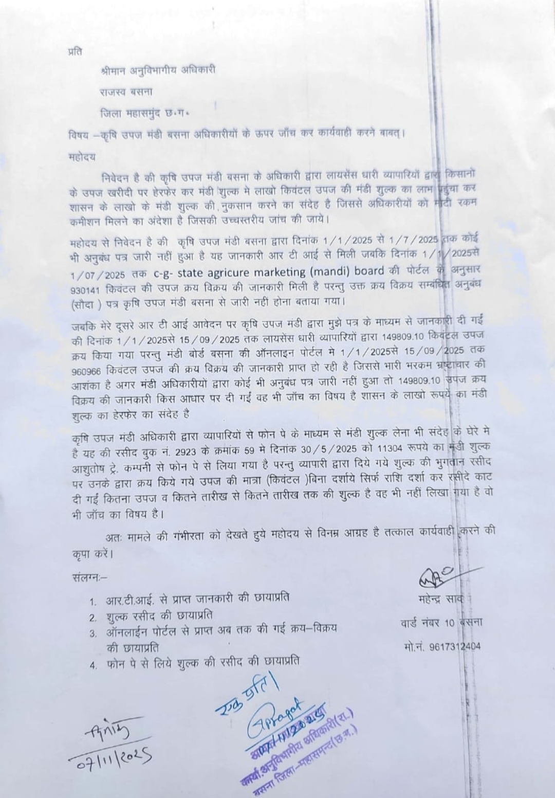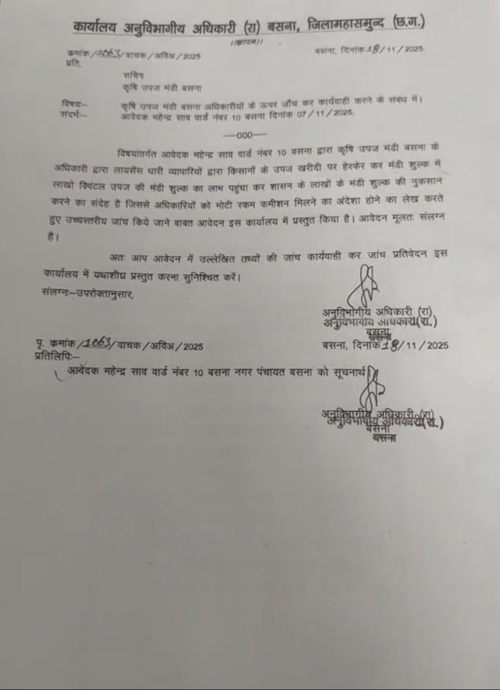 जिसकी उच्चस्तरी जांच कर उचित कार्यवाही के लिए अनुविभागीय अधिकारी बसना को 7/11/25 को आवेदन किया गया था जिसे अनुविभागीय अधिकारी बसना द्वारा जांच एवं कार्यवाही के लिए कृषि उपज मण्डी बसना के सचिव को ज्ञापन 18/11/25 को प्रेषित किया गया है