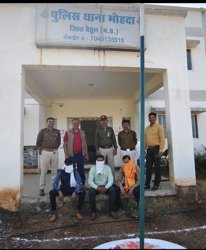 दामजीपुरा /बैतूल जिले के थाना मोहदा के अपराध क्र. 230/2022 धारा 191,192,341,294,427,34 भादवि 34(2) आबकारी एक्ट में फरार आरोपीयो की तलाश पतारसी हेतू श्रीमान पुलिस अधीक्षक महोदय के मार्गदर्शन में एवं अतिरिक्त पुलिस अधीक्षक महोदय तथा एसडीओपी महोदय भैंसेदही के निर्देशन मे गठीत टीम थाना प्रभारी थाना मोहदा व्हीपी मोर्य, प्रआर 327 सचिन माहोरे, आर 704 सुरेन्द्र धुर्वे, आर 126 रमेश चौहान, आर 412 अजय डोंगरे सेनिक 177 अशोक नरें के प्रयासो से टीम बनाकर कुंदन ढाना देसली मे दबित दी गई। दिनांक 31.01.2025 के सुबह दबिश दी गई जहाँ आरोपीगण 1. राकेश जैसवाल पिता सुरजप्रसाद जैसवाल उम्र 44 साल निवासी कुंदनढाना देसली 2. दिपक मुंडे पिता लच्छु मुंडे जाति गौली उम्र 25 साल निवासी कुंदनढाना देसली 3. कपिल पिता राजेन्द्र आर्य उम्र 29 साल निवासी ग्राम मोहदा को घेराव कर पड़का जिन्होने अपना जुर्म स्वीकार किया। जिन्हे अपराध धारा सदर मे गिरफ्तार कर उनके परिजनो को दी गई। बाद श्रीमान जेएमएफसी महोदय के न्यायालय मे पेश करने हेतू रवाना किया गया। पुर्व मे दिनांक उक्त प्रकरण में संलिप्त आरोपी विनय पिता सुनील आर्य उम्र 24 साल निवासी ग्राम हिड़ली थाना चिचोली से गिरफ्तार कर जेएमएफसी न्यायालय भैंसेदही पेश किया गया था जो वर्तमान मे जिला जेल बैतूल मे निरुध्द है। उक्त कार्यवाही में निरीक्षक विष्णु प्रसाद मोर्य, सउनि बलीराम बम्हनेले, सउनि राज पहाडे, प्रआर 327 सचिन माहोरे, महिला प्रआर 420 गायत्री पन्दे, चालक प्रआर 630 भारतेन्द्र आरसे, आर 704 सुरेन्द्र धुर्वे, आर 126 रमेश चौहान, आर 412 अजय डोंगरे सेनिक 177 अशोक नरें की भुमिका सराहनीय रही है।