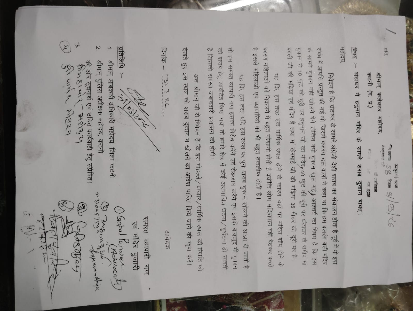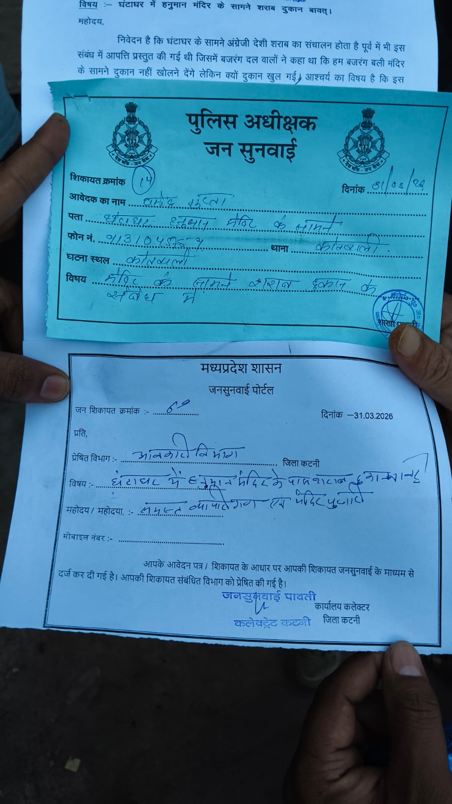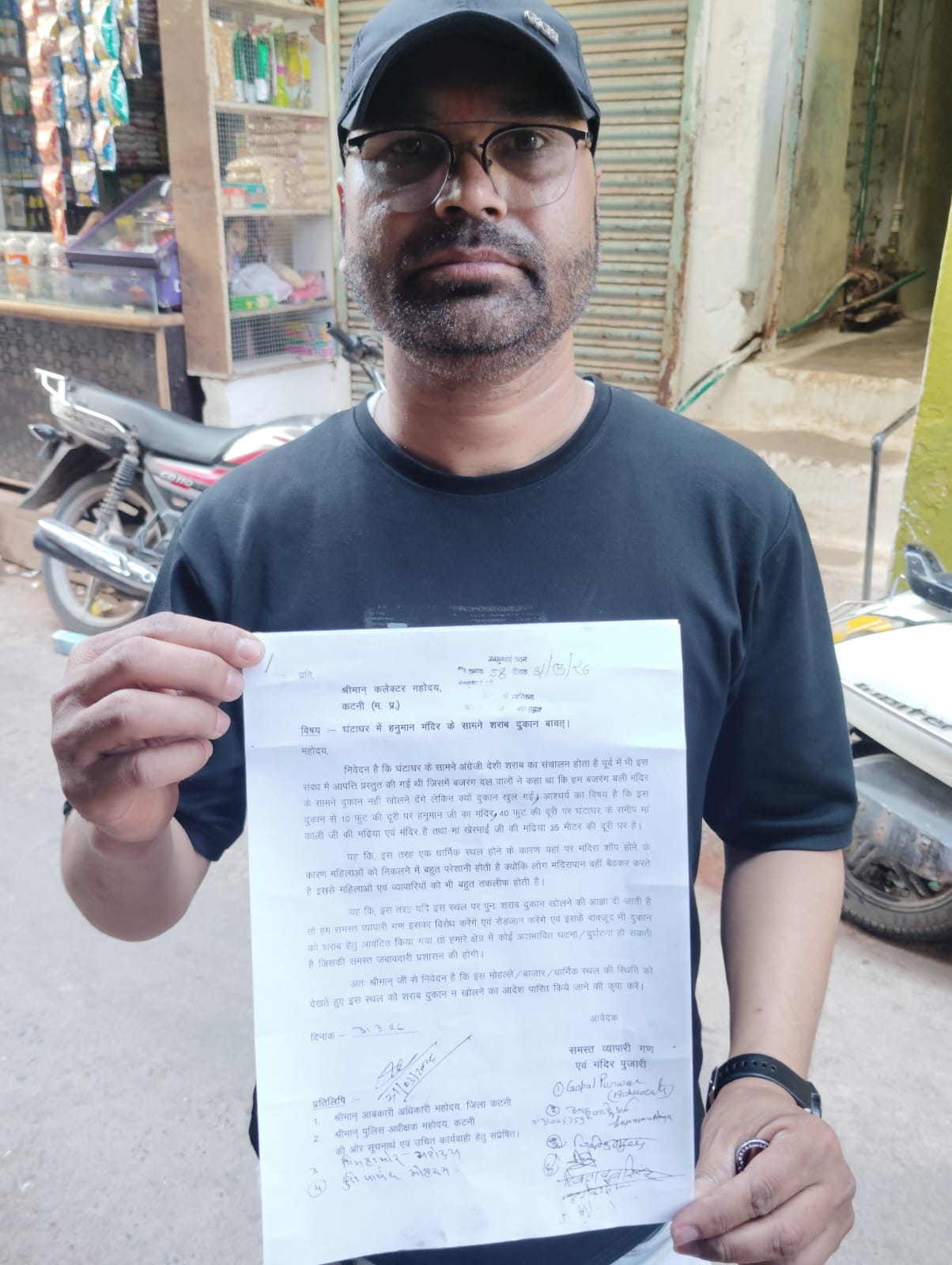 कटनी। शहर के घंटाघर क्षेत्र में स्थित हनुमान मंदिर के ठीक सामने संचालित हो रही शराब दुकान को लेकर स्थानीय नागरिकों और व्यापारी वर्ग में भारी आक्रोश देखने को मिल रहा है। इस संबंध में आज दिनांक 31 मार्च 2026 को जनसुनवाई के दौरान कलेक्टर महोदय के समक्ष शिकायत आवेदन प्रस्तुत कर शीघ्र कार्रवाई की मांग की गई।