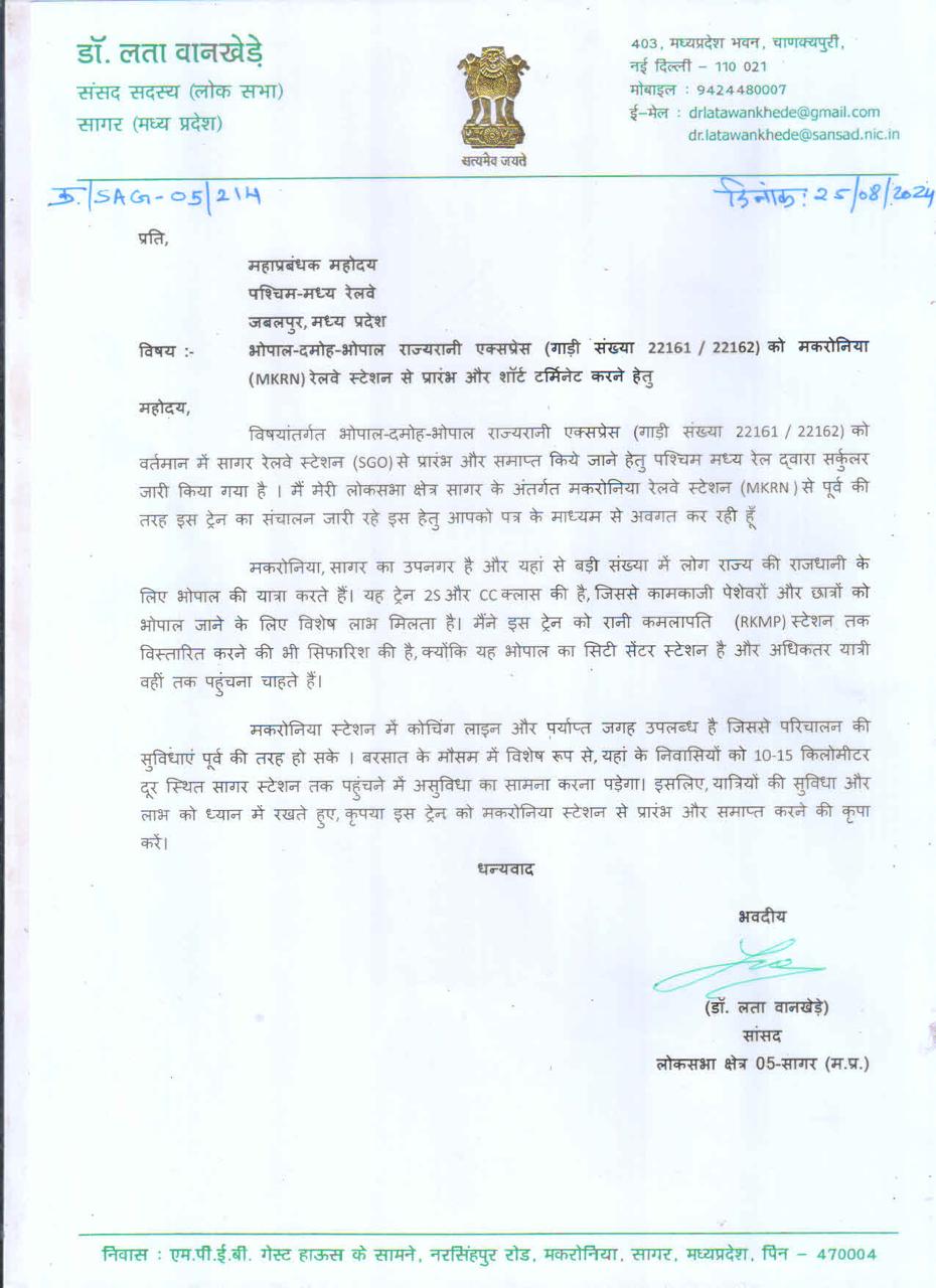 : सांसद सागर की मांग पूरी अब मकरोनिया से चलेगी राज्यरानी सागर सांसद डॉ लता वानखेड़े के प्रस्ताव पर डीआरएम से लगी मंजूरी की मुहर