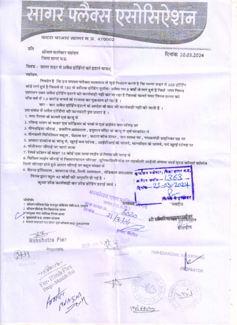 : सागर फ्लैक्स एसोसिऐशन ने शहर लगे अवैध होर्डिंग्स हटाने की मांग को लेकर कलेक्टर को दिया ज्ञापन