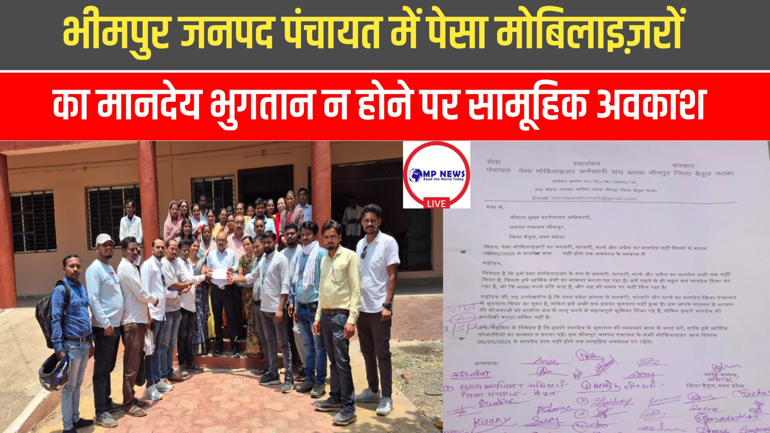 भीमपुर जनपद पंचायत, जिला बैतूल, मध्य प्रदेश में पेसा मोबिलाइज़रों ने अपनी मांगों को लेकर हड़ताल पर जाने का फैसला किया है। पेसा मोबिलाइज़रों का आरोप है कि उन्हें जनवरी, फरवरी, मार्च और अप्रैल का मानदेय अभी तक नहीं मिला है, जिससे उनकी आर्थिक स्थिति काफी गंभीर हो गई है।ब्लॉक अध्यक्ष पेसा मोबिलाइज़र संघ ने मुख्य कार्यपालन अधिकारी को एक पत्र लिखकर मांग की है कि उनके मानदेय का भुगतान जल्द से जल्द किया जाए। पत्र में कहा गया है कि मध्य प्रदेश शासन से जनवरी, फरवरी और मार्च का मानदेय जिला पंचायत में भुगतान किया जा चुका है, लेकिन उन्हें अभी तक इसका भुगतान नहीं हुआ है।पेसा मोबिलाइज़रों ने चेतावनी दी है कि अगर उनके मानदेय का भुगतान नहीं किया गया तो वे आज दिनांक 09/05/2025 से मानदेय प्राप्त होने तक सामूहिक अवकाश पर रहेंगे। इस गंभीर परिस्थिति में, पेसा मोबिलाइज़रों ने सामूहिक अवकाश लेने के लिए मजबूर होना पड़ा है।*मुख्य मांगें:*- जनवरी, फरवरी, मार्च और अप्रैल का मानदेय जल्द से जल्द भुगतान किया जाए।