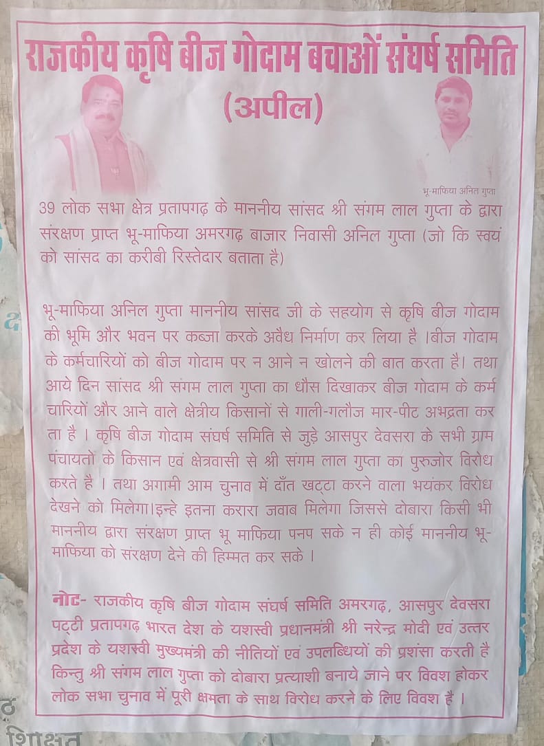 : प्रतापगढ़ सांसद संगम लाल गुप्ता के विरोध में अमरगढ़, गौरमाफी, ढकवा,रामगंज,आसपुर देवसरा समेत कई बाजारों में चिपकाएं गए पोस्टर