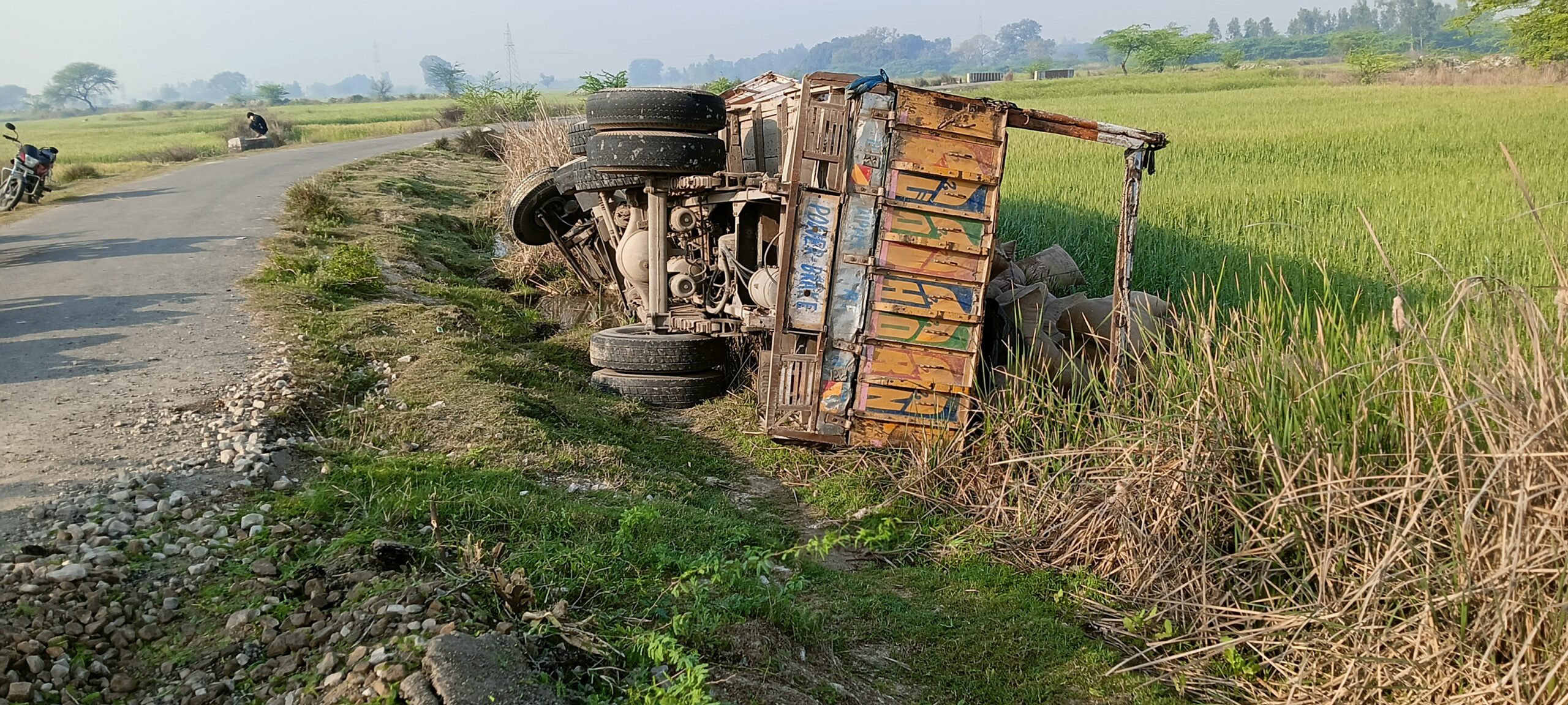 : गेहूं लदा ट्रक खाई में पलटा बाल-बाल बचा चालक व कंडक्टर
